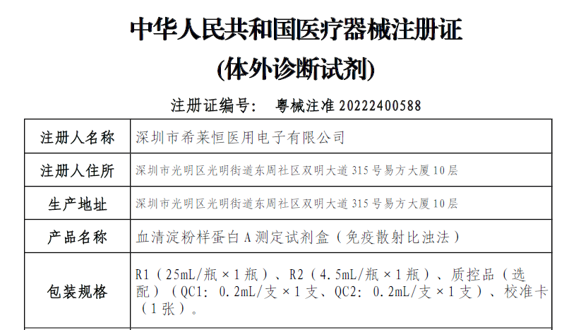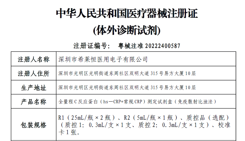 近日,深圳希莱恒公司在全自动特定蛋白分析仪(H780/H790)和特定蛋白分析仪(H700)的原有测试项目上再次升级扩展,将全量程C反应蛋白(hs-CRP+常规CRP)测定试剂盒(免疫散射比浊法)与血清淀粉样蛋白A测定试剂盒(免疫散射比浊法)联合检测。同时在2022年5月06日由广东省药品监督管理局下发正式的注册证文件。