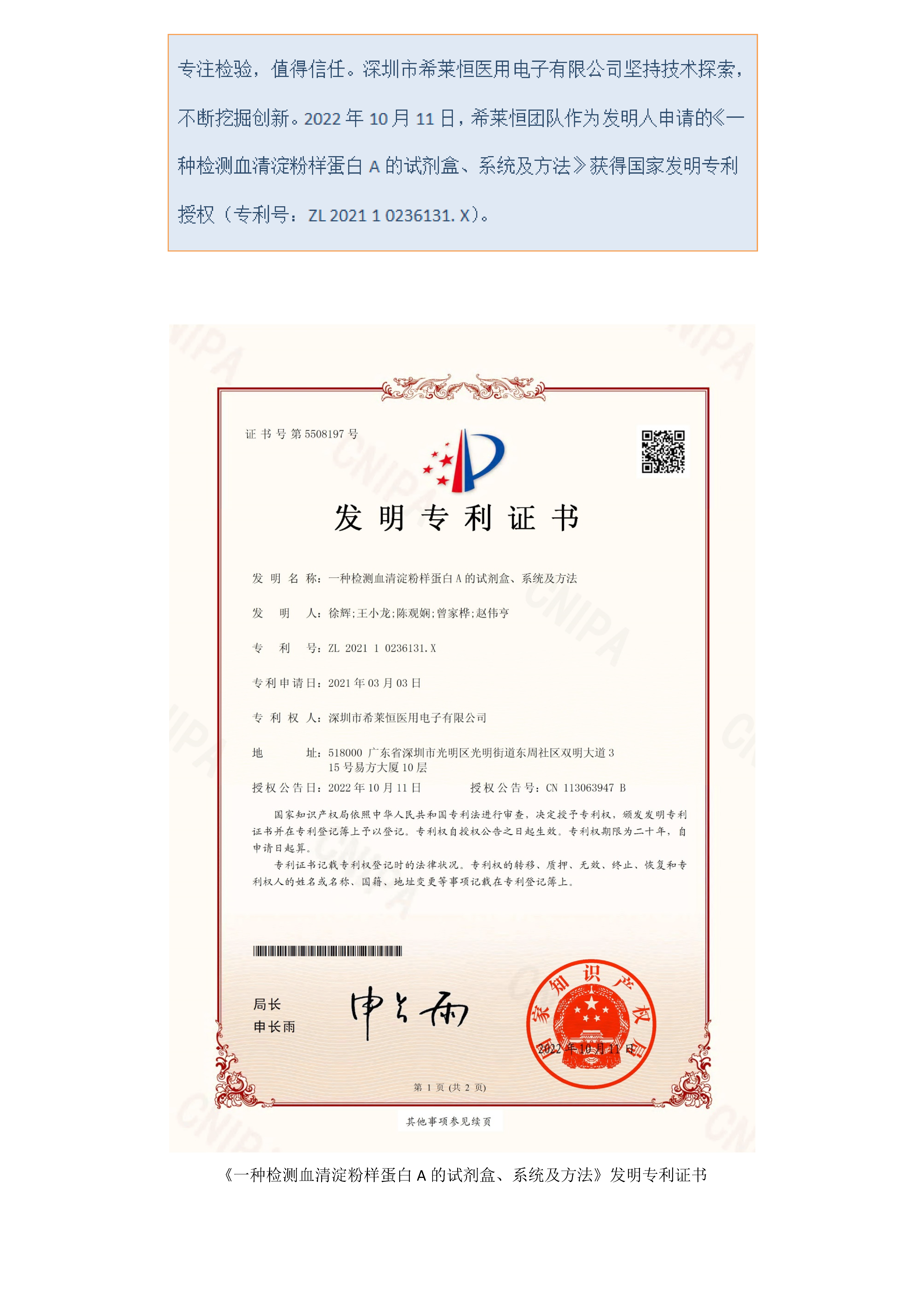 实力认证!深圳市希莱恒医用电子有限公司喜获国家发明专利证书