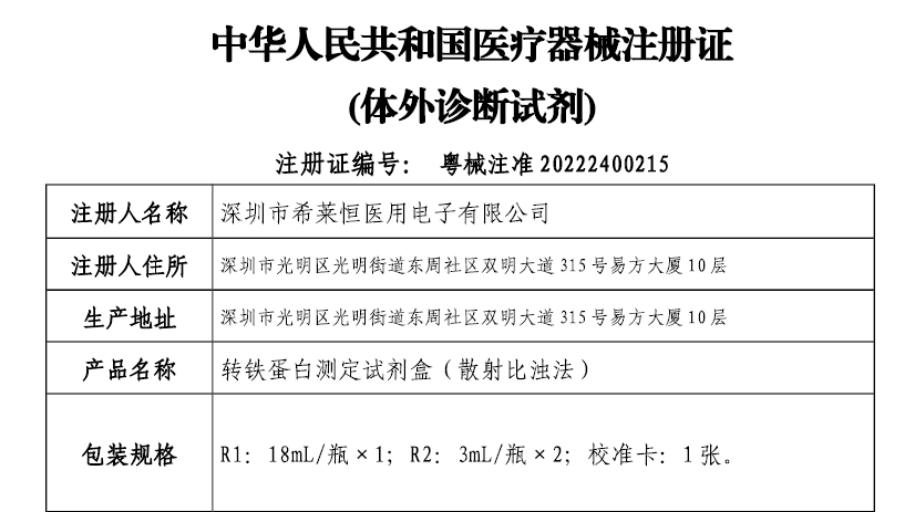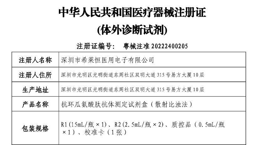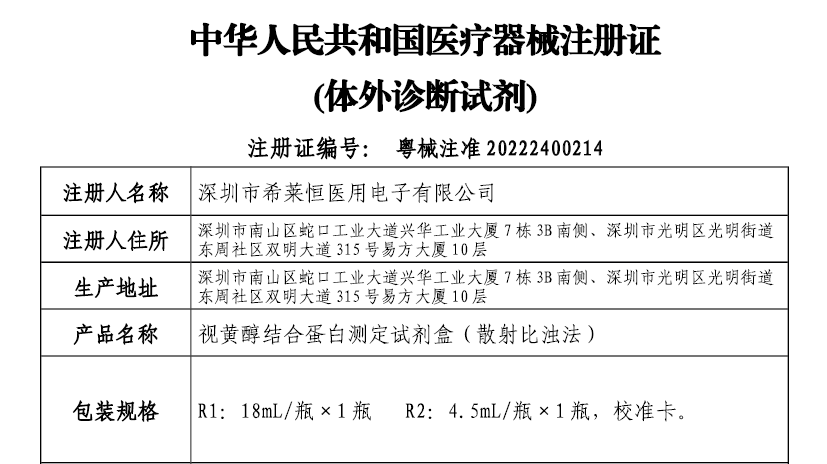 近期,深圳希莱恒公司在全自动特定蛋白分析仪(H790/H780)和特定蛋白分析仪(H700)的原有项目上扩增4个新项目,分别是:抗环瓜氨酸肽抗体测定试剂盒(散射比浊法)、转铁蛋白测定试剂盒(散射比浊法)、视黄醇结合蛋白测定试剂盒(散射比浊法)和β2-微球蛋白测定试剂盒(散射比浊法)。同时在2022年1月30日由广东省药品监督管理局下发正式的注册证文件。
