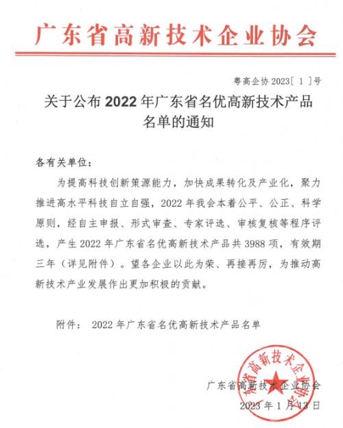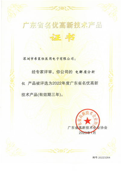 近日,为展示广东省高新技术产业发展成果,树立优秀榜样、宣传优质产品,推动广大高新技术企业,加强科技创新,广东省高新技术企业协会公示了《2022年度广东省名优高新技术产品名单》。其中,深圳市希莱恒医用电子有限公司的“电解质分析仪”产品被评选为2022年度广东省名优高新技术产品,并获得荣誉证书。